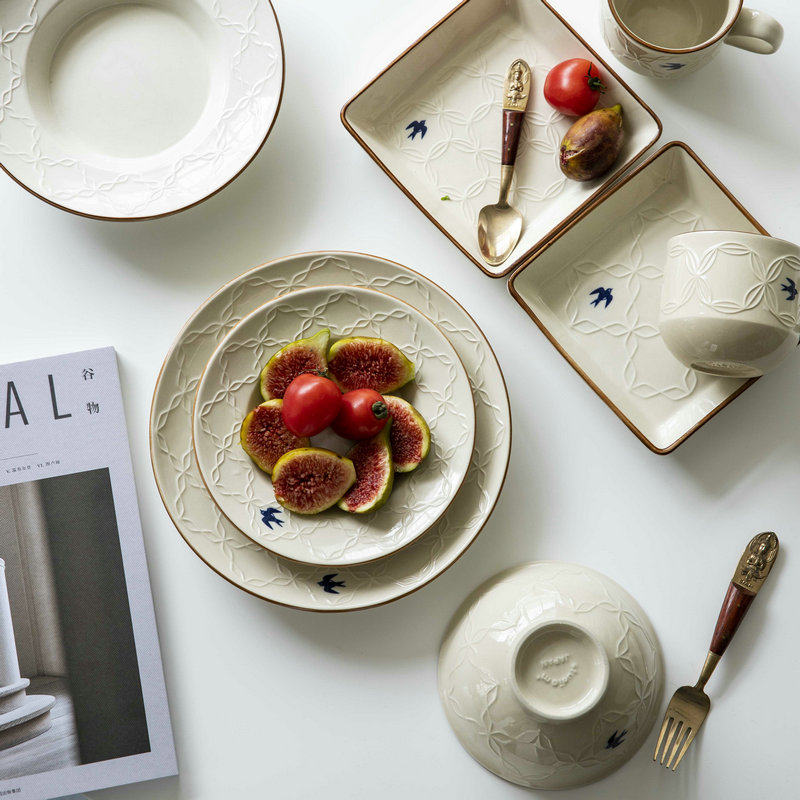 设计师款 哑光浮雕燕子陶瓷盘家用盘牛排盘西餐盘日式复古餐具热门设计联盟服务商